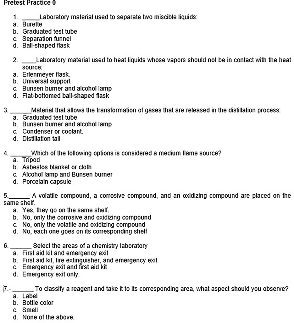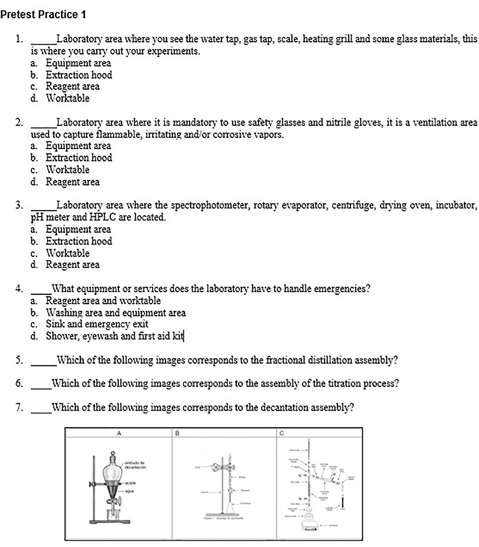 To measure student learning, a knowledge test was applied before and after each practice. The tests consisted of 7 questions, each with four response options. The tests were validated by the Academy of Science Teachers of Prepas Tec in Campus Cuernavaca and Campus Estado de México (see Figures 1, 2).
