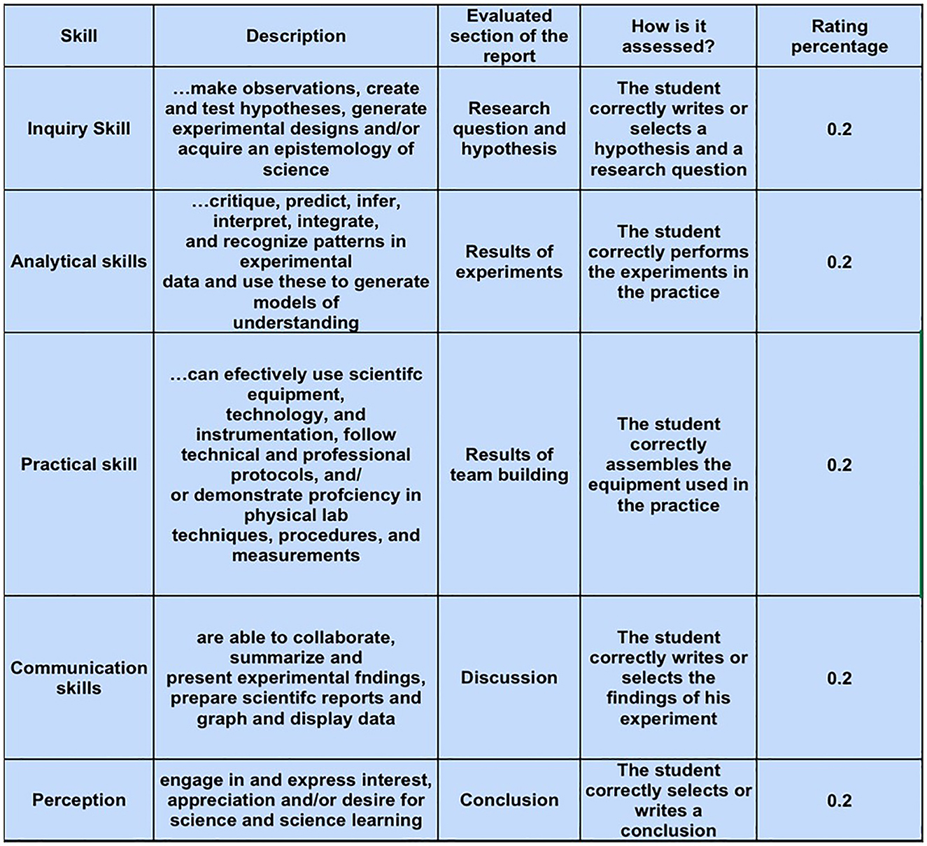 They also integrate perception, that is, interest, appreciation, and desire to learn science; analytical skills, such as the ability to infer, interpret, predict, integrate information, and recognize patterns in experimental data; and finally, scientific and social communication, which encompasses collaboration, the presentation of findings, and the preparation of technical reports. These dimensions are aligned with the scientific and engineering practices described by the National Research Council (2012), such as formulating questions, developing models, analyzing data, using mathematical thinking, constructing explanations, and communicating results. According to the authors, these skills can be developed both in physical laboratories and in virtual or remote environments, and their effectiveness depends on multiple factors beyond the type of technology used, such as the perception of presence, interaction, and student motivation (Hernández-de-Menéndez et al., 2019).