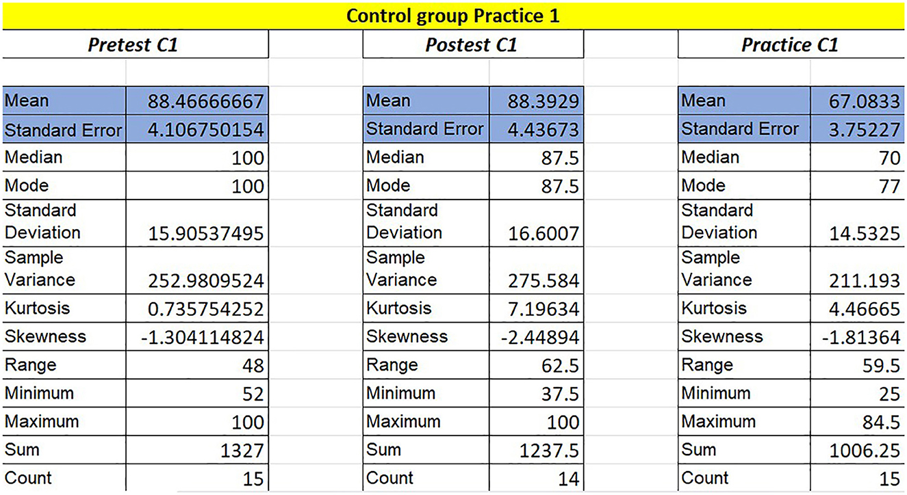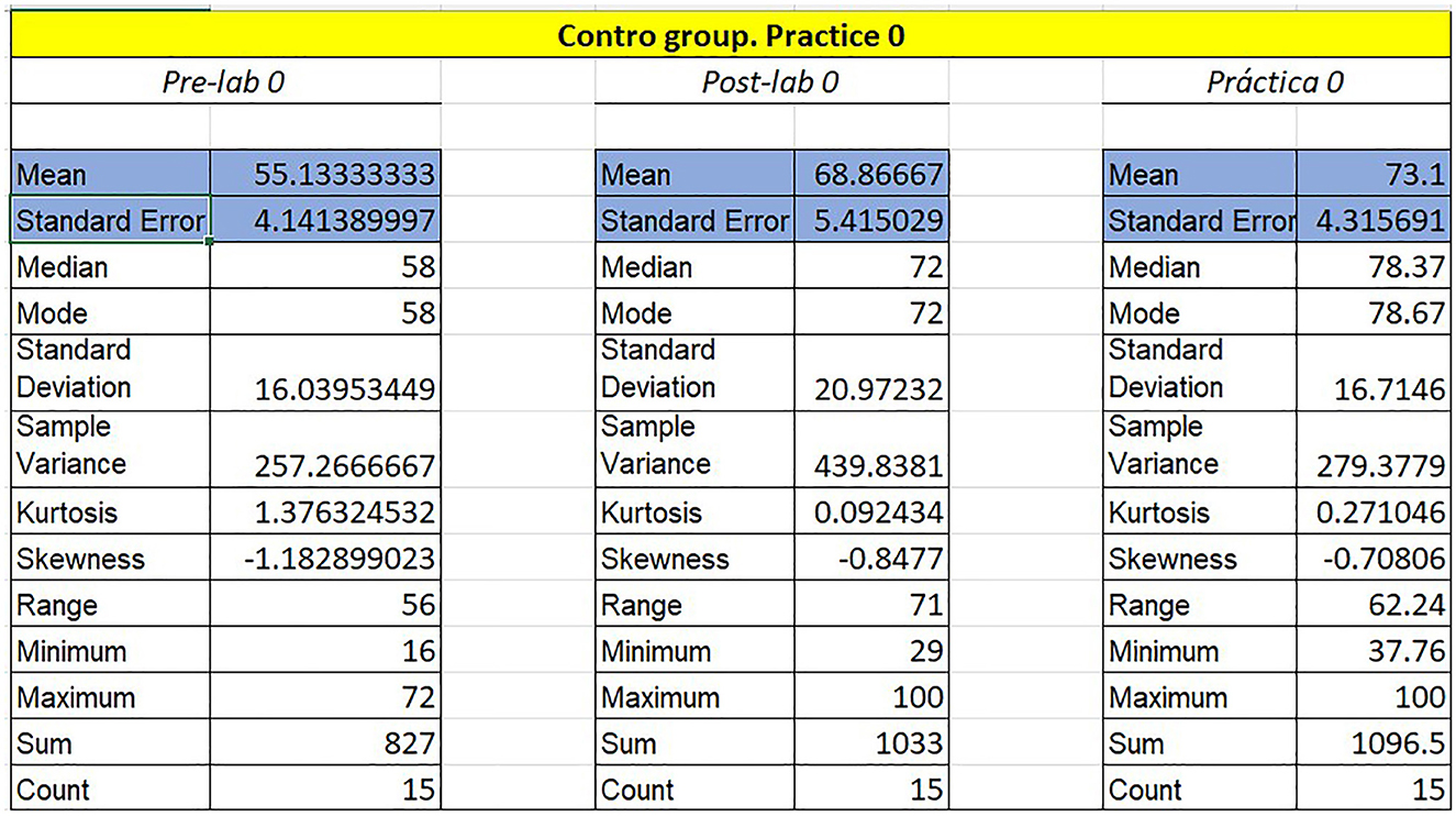 The results of applying descriptive statistics to the control group of Practice 0 are shown in Figure 4.
