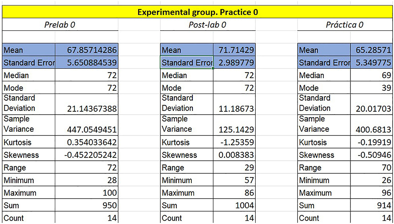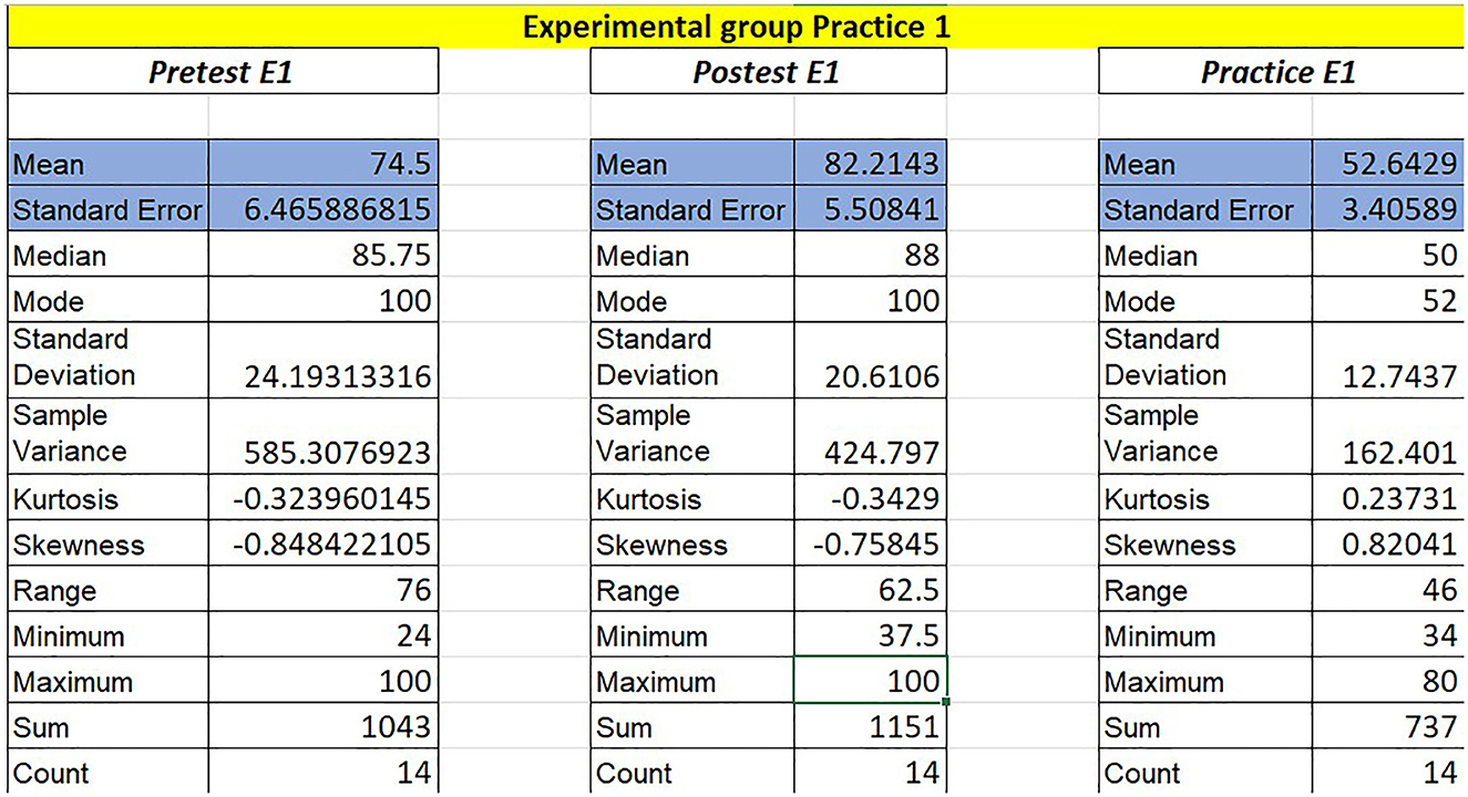 The results of applying descriptive statistics to the experimental group of practice 1 are shown in Figure 8.