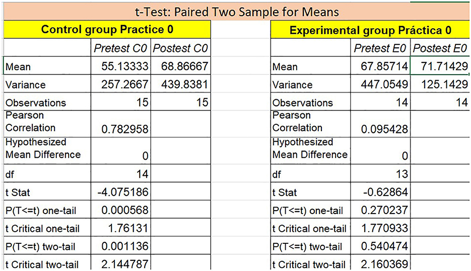 The results of applying inferential statistics to the control and experimental groups of practice 0 are shown in Figure 6.