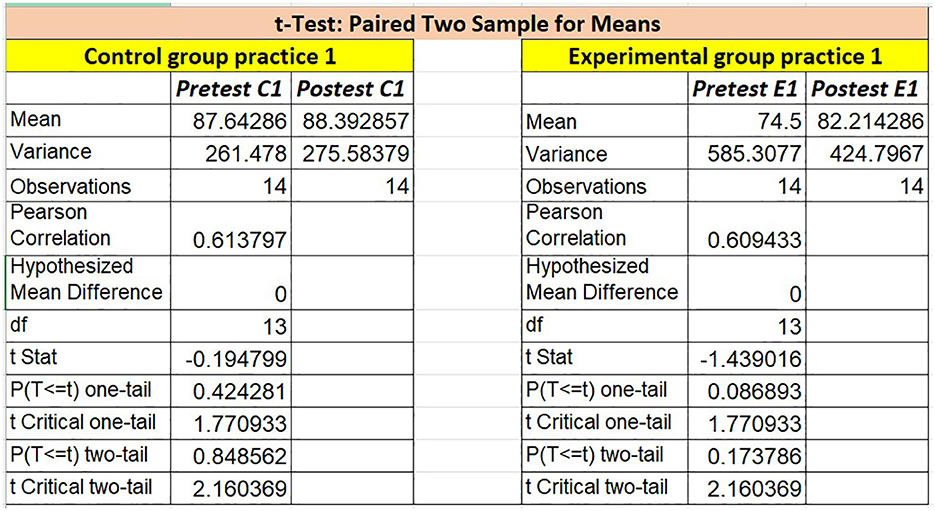 At the traditional significance level (α = 0.05), neither of the two groups in Practice 1 showed a significant change from pretest to posttest. The experimental group showed a greater variation in the mean, but it was not statistically significant (p = 0.173 in two tails and p = 0.087 in one tail). Although the results show an improvement in the scores of the experimental group, there is not enough evidence to reject the null hypothesis that there is no difference in learning in either of the two groups.