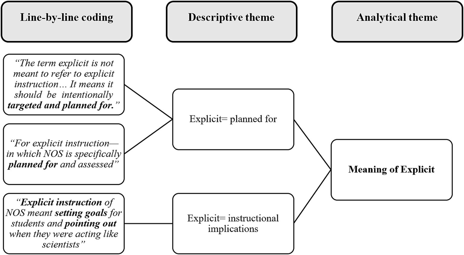 At this stage, the research aimed to go beyond the individual findings of selected studies and generate higher-level concepts or analytical themes that synthesize the meaning of ER in NoS education. The development of analytical themes involved inferring implications, connections, and broader interpretations from the descriptive themes. Three of the researchers engaged in extensive discussions. They iteratively refined the analytical themes until they accurately encompassed all the initial descriptive themes and provided insights beyond the individual study findings. For instance, the descriptive theme of “explicit = planned for” was mentioned earlier. Another meaning given to explicit inside the text units was the descriptive theme “explicit = instructional implications.” These two descriptive themes were then incorporated into the analytical theme labeled “Meaning of explicit” (see Figure 2).