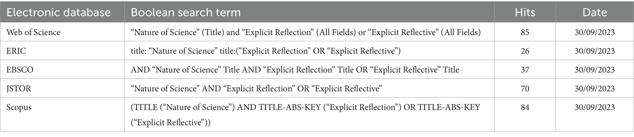 The electronic databases Web of Science, the Education Resources Information Center (ERIC), EBSCO, JSTOR, and Scopus were explored to identify literature within this review’s scope. The databases were selected for their relevance and extensive coverage of educational research. In 2000, Abd-El-Khalick and Lederman conducted a pivotal review distinguishing between explicit and implicit approaches to NoS education. Notably, they were the first to introduce the term “explicit reflection,” emphasizing reflection as a core element for effective NoS education. This marked a shift in the field, as subsequent research began to adopt and build upon the concept of ER. To ensure the inclusion of the most recent and pertinent studies, articles published from 2000 onwards were focused on. Boolean search terms were utilized, as detailed in Table 1, to facilitate the identification of relevant literature.