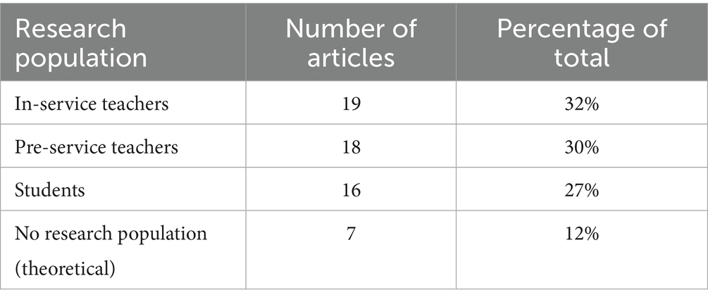 Of the 60 articles, 53 (88%) specified their research population, while the remaining seven (12%) predominantly consisted of theoretical discussions without explicitly mentioning a defined research population. Three distinct categories were identified among the 53 articles with a defined research population. Nineteen articles (32%) focused on in-service teachers as the primary research population, investigating the effects of ER on NoS education within this group. Eighteen (30%) researched pre-service teachers, exploring how ER could enhance their understanding of the NoS during their training. The remaining 16 (27%) involved students as the research population, examining the impact of ER on their development of NoS concepts (Table 2).