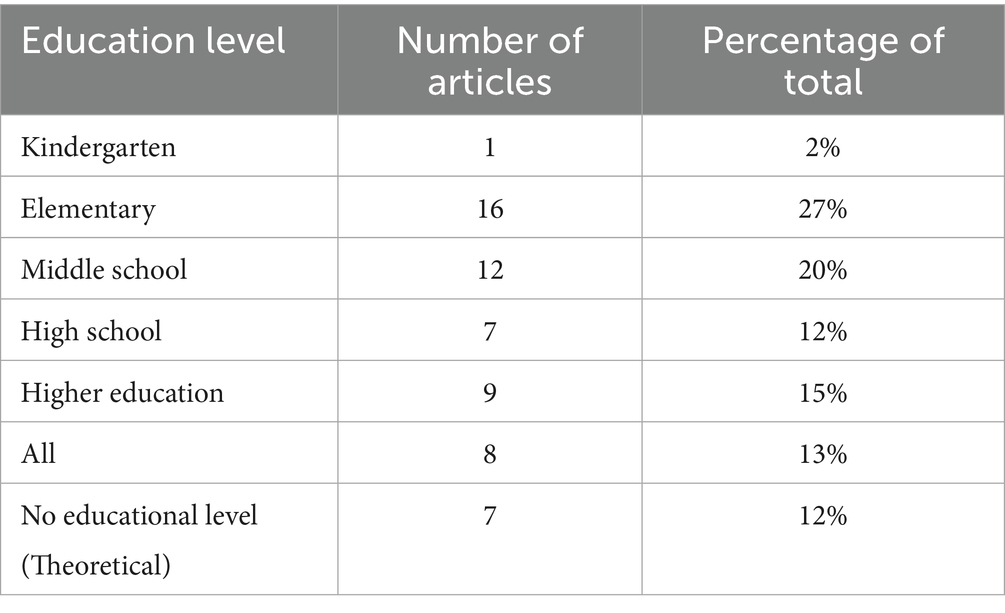 The examination of educational levels featured in the 60 selected studies identified five distinct categories: “kindergarten,” “elementary,” “middle school,” “high school,” and “higher education.” Of the articles, 53 (88%) explicitly delineated their intended educational level. Some studies included multiple educational levels, which were appropriately classified under the “all” levels category.