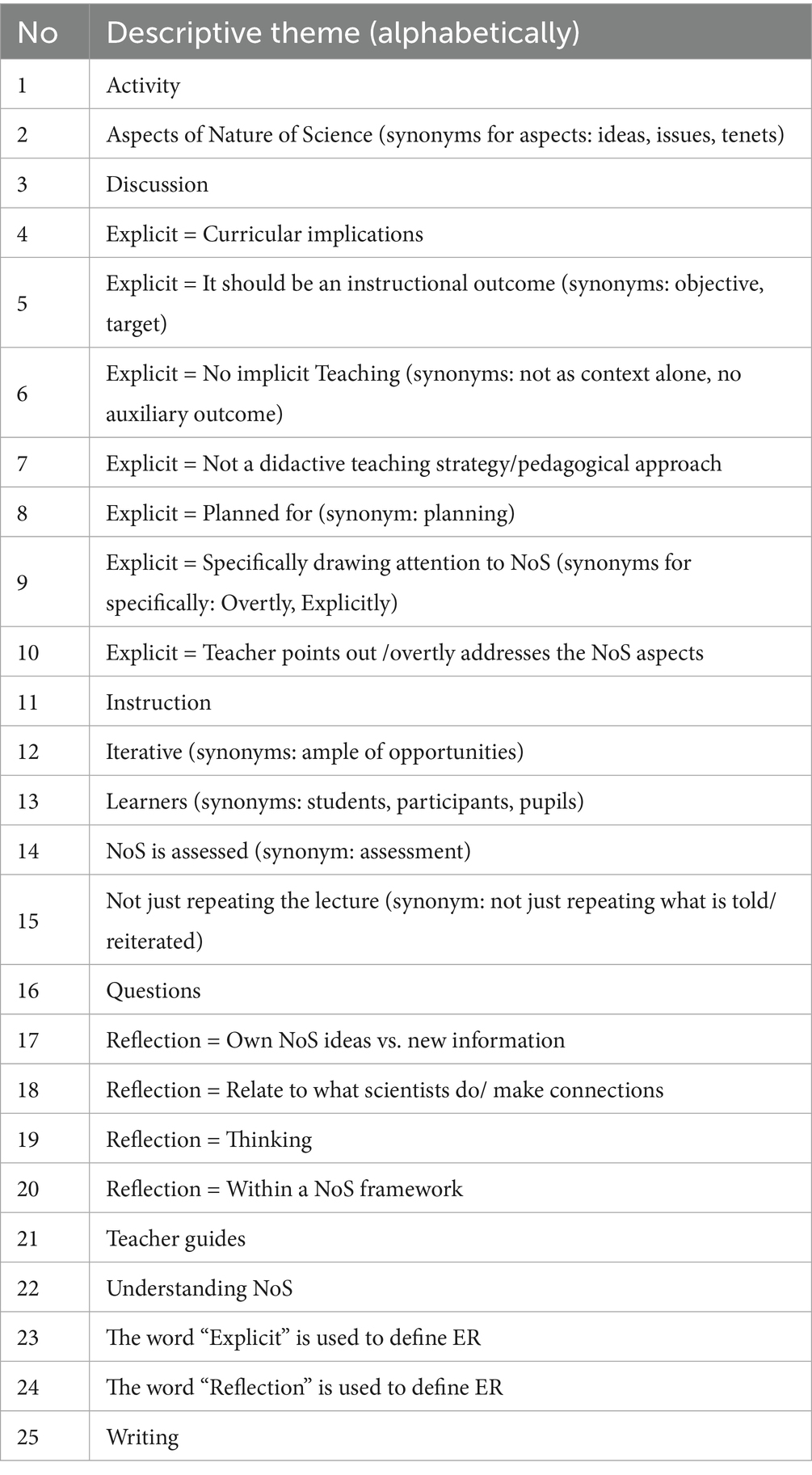 As a result of the analysis and categorization of the free line-by-line coding, 25 distinct descriptive themes were constructed, forming the foundational framework for discerning key elements characterizing ER definitions within NoS education. The descriptive themes are presented in Table 4.