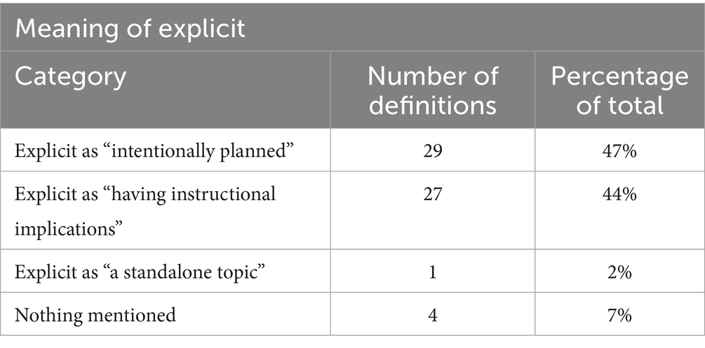 In analyzing the 61 definitions, diverse interpretations of the term “explicit” were observed within the context of ER in NoS education. Of these, 29 provided definitions that categorized “explicit” as an intentional and planned focus on NoS education integrated within the curriculum. Conversely, 27 defined “explicit” in the context of instructional implications for NoS education.