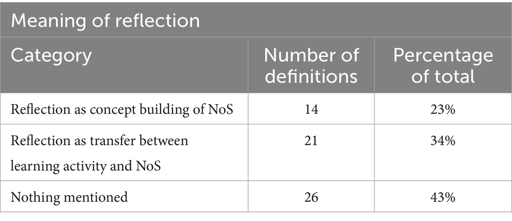 The primary observation on the meaning of reflection is that it is frequently absent from specific definitions within ER discourse in NoS education. This point will be explored further later in the discussion. Also, it was observed that definitions that did give an explanation of what was meant by the concept of “reflection” as a tool for NoS education follow two distinctive paths. Firstly, reflection was seen as a means to foster a profound conceptual understanding of NoS principles, encouraging critical thinking and internalization of concepts. This constructivist approach emphasized active engagement and the establishment of a solid foundation of NoS knowledge. Secondly, it could serve as a tool for transferring NoS knowledge from the classroom to real-world scientific practices, bridging the gap between theory and application. This approach highlights the practical relevance of NoS education, preparing learners to effectively apply NoS principles in scientific contexts. Future researchers may consider integrating these two dimensions, defining reflection in NoS education as a multifaceted process encompassing both conceptual building and knowledge transfer, thereby offering a comprehensive and balanced approach.