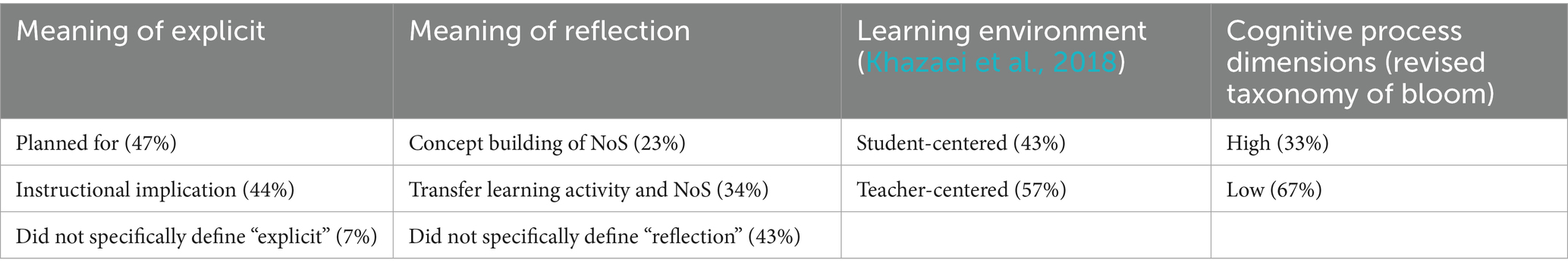 Concerning the meaning of explicit, the results of this study highlight the different interpretations and definitions of the term “explicit” in the context of NoS education. The majority of the articles analyzed understood ER as intentional planning and targeting of the topic within the curriculum, rather than an instructional approach. Nevertheless, a considerable number of articles viewed ER as an instructional element, emphasizing the need for explicit teaching and didactic approaches to teaching NoS. These findings demonstrate the need for further exploration and clarification of the term “explicit reflection” in NoS education.
