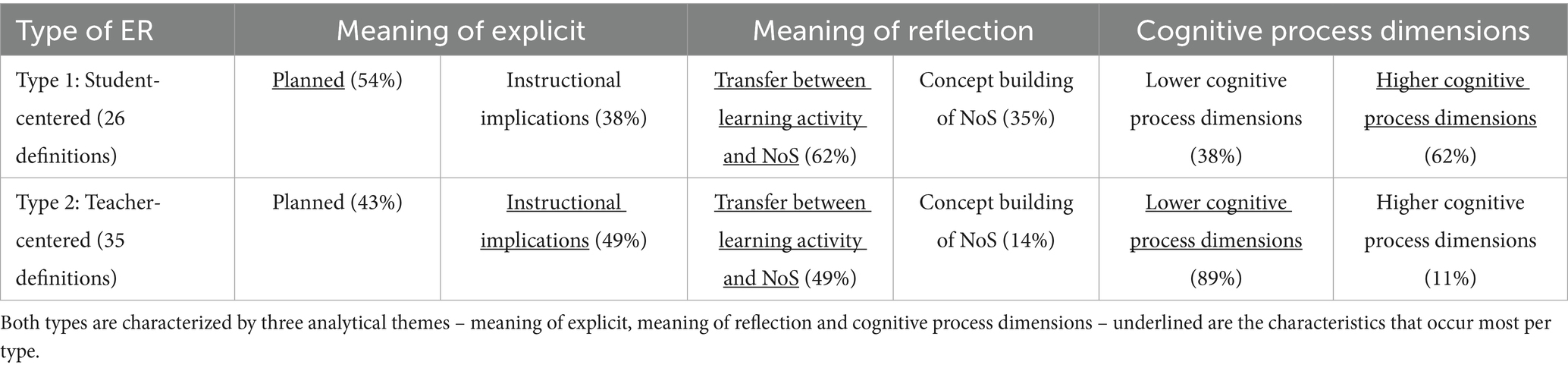 To enhance the synthesis of this complex topic, it was examined through the lens of the learning environment, shedding light on distinct discourse patterns in definitions of ER. Notably, student-centered ER definitions prioritized action verbs that reflect higher-order cognitive processes, which may be more beneficial when the goal is to foster critical thinking in NoS education. This type also demonstrated greater clarity, offering more often definitions for both the concepts of “explicit” and “reflection”. In contrast, teacher-centered ER definitions frequently emphasized “instructional implications,” highlighting a focus on teaching methods rather than the creation of meaningful learning experiences.