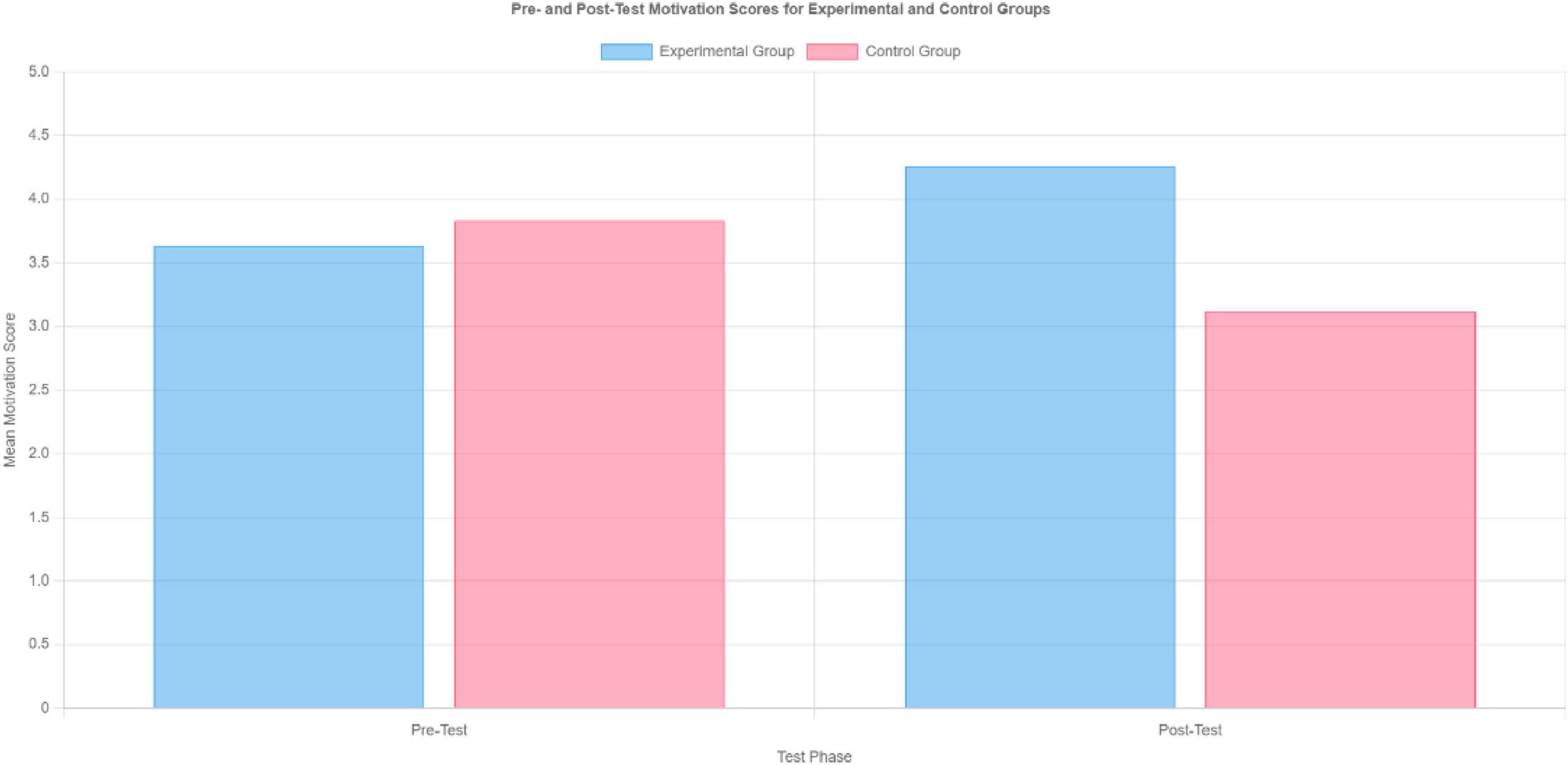 Figure 1. Comparison of pre- and post-test mean motivation scores for the experimental and control groups on the Mathematics Learning Motivation Scale (MLMS).