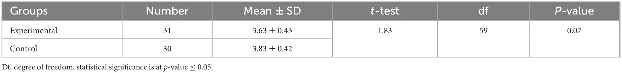 Table 1 shows no statistically significant differences in the pre-test performance of the experimental and control groups on the motivation scale for learning mathematics, with a p-value of 0.07, which is greater than 0.05. This indicates that both groups were equivalent in their motivation to learn mathematics before the implementation of the FCS.