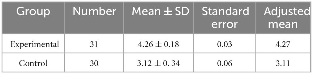 Table 2 shows clear differences between the means of the experimental and control groups in the post-test application of the motivation scale. The experimental group had a mean score of 4.26 with a standard deviation of 0.18, while the control group had a mean score of 3.12 with a standard deviation of 0.34. To determine whether these differences were statistically significant, an Analysis of Covariance (ANCOVA) was conducted, as displayed in Table 3.