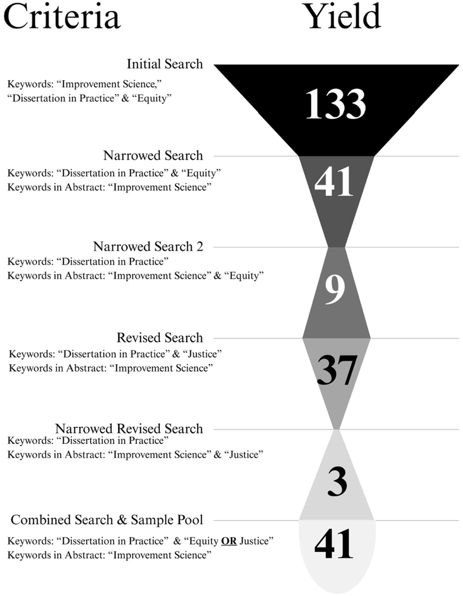 Our initial search using “Dissertation in practice,” “Improvement Science,” and “equity” yielded 133 dissertations. From the initial pool of 133 dissertations, we narrowed the search by adding the criteria that “Improvement Science” be in the abstract. This reduced the sample to 41. When both “Improvement Science” and “equity” were in the abstract, that narrowed the field to nine. We did a similar search with “justice” in place of “equity.” Searching with “justice” as a keyword and the requirement of “Improvement Science” in the abstract yielded 37. A subsequent search with “justice” and “Improvement Science” in the abstract yielded three. Our final search used “dissertation in practice” with “equity” or “justice” and “Improvement Science” in the abstract, giving us an initial pool of 41. There was considerable overlap between the searches; we found that everyone using the word “justice” also used the word “equity”.