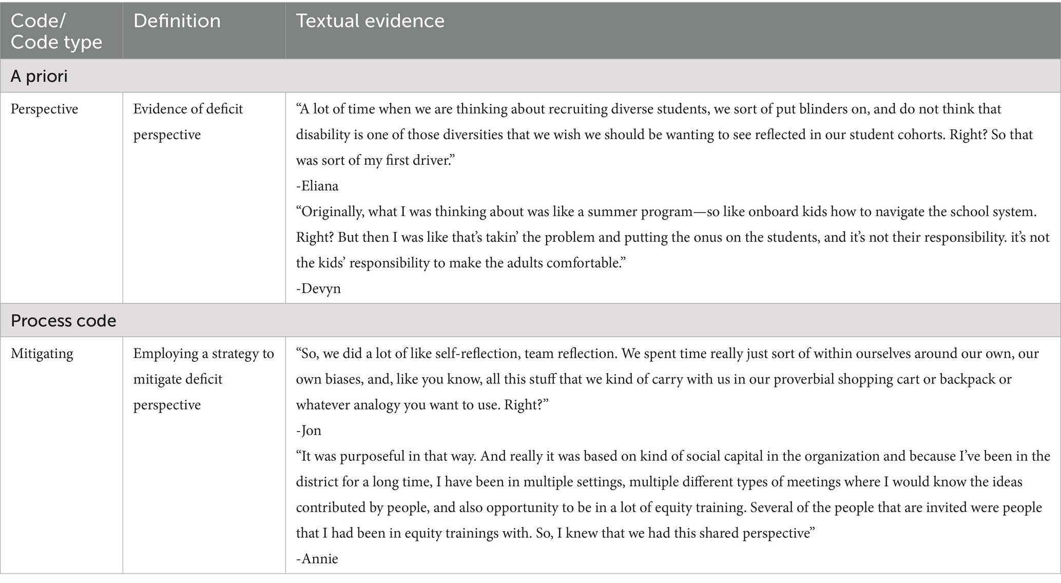 After the interviews were conducted and transcribed, we coded both interviews and document analysis notes using both a priori and inductive coding strategies. Our a priori codes were guided by key Improvement Science processes such as problem definition and theory development, as well as definitions or evidence of deficit perspectives. Because mindsets are often most evident during decision-making, we paid particular attention to decision-making inflection points throughout the improvement process, such as problem definition and change idea selection. We began with a priori codes related to stages so we could identify mitigation strategies at different steps of the improvement cycle. We also used process coding, which is used to “connote observable and conceptual action in the data,” to identify deficit-mitigating actions (Miles et al., 2014, p. 66). Our first round of coding consisted of multiple rounds of independent coding followed by discussions to calibrate and ensure internal reliability among our research team. Table 1 provides an illustrative example of our a priori and process codes.