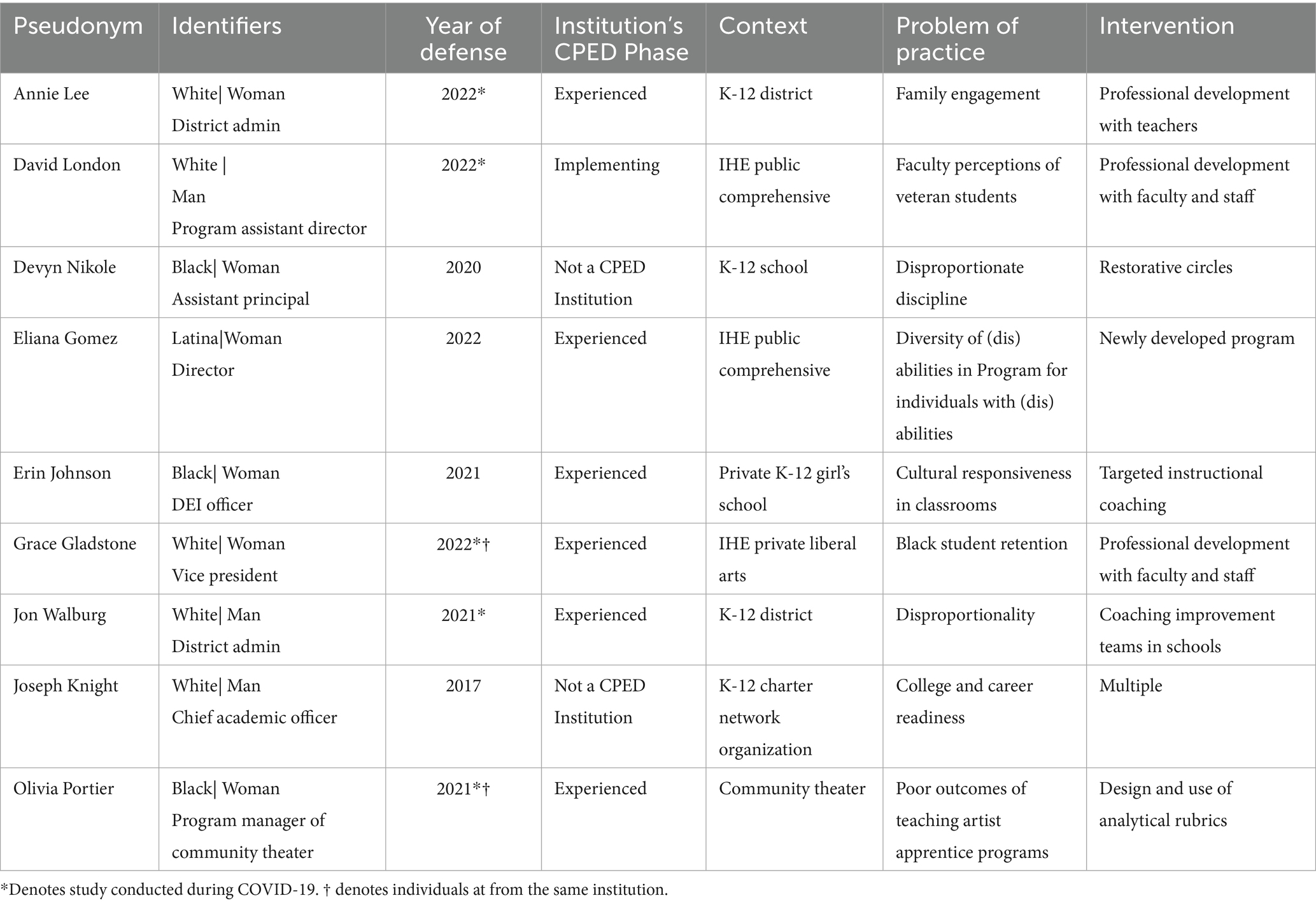 This analysis presents data from nine individual cases of scholar-practitioners using Improvement Science to address a problem of practice. The cases show scholar-practitioners in K-12, higher education, and community organization settings. These cases represent a diversity of leadership positions at different levels of the organization. Five of the nine scholar-practitioners identified as white; three identified as Black, and one as Latinx. Six of the scholar-practitioners were women, and the remaining three were men. Most (7) of the scholar-practitioners attended CPED institutions. Two respondents were graduates from the same institution: Grace Gladstone and Olivia Portier, but they were in different programs and different cohorts. Table 2 provides an overview of the nuances of each case.