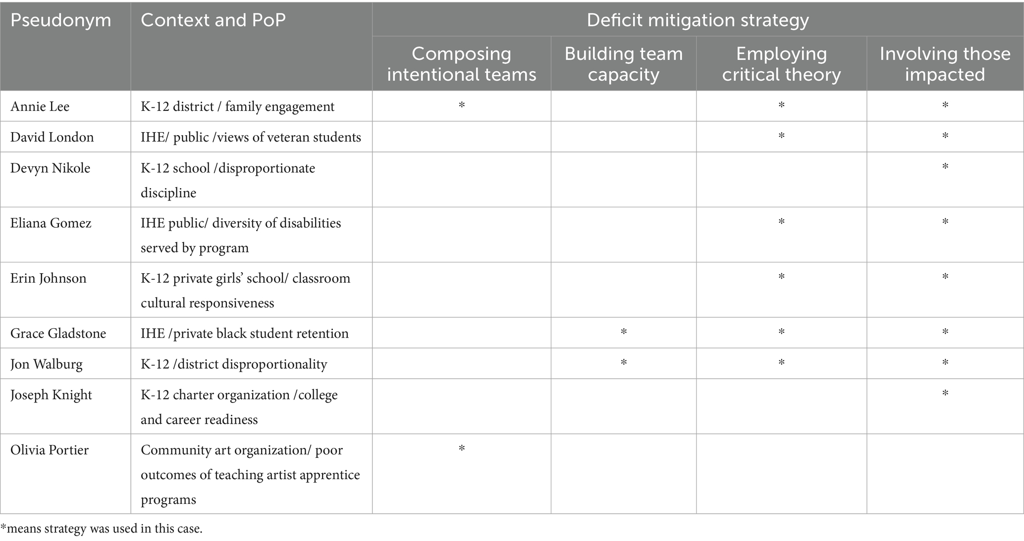 The findings of this study are presented in the order of the research questions. First, we present findings on how scholar-practitioners conceptualize and define deficit mindsets (RQ1), then on the strategies they employed to mitigate those mindsets in CI work (RQ2). The scholar-practitioners conceptualized deficit mindset as a cognitive framework that is used to explain and justify inequality based on group membership, especially group membership related to race and social class. The mitigation strategies identified in the cases are presented in ascending order in which we found them in the cases, from least employed to most frequently employed: composing intentional teams (2), building capacity (2), employing critical theory (6), and involving those impacted (8).