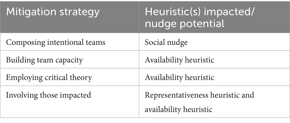 Mintrop and Zumpe (2019) write specifically about a common improvement mindset with “five heuristics” or interpretive frames that illustrate patterns of thinking exhibited by educational leaders. In their study of leaders engaged in CI work, the evident heuristics were (1) my problem is the absence of my solution, (2) change is about filling an empty vessel with new material, (3) learning is implementing, (4) designing aims at conventions, and (5) rationality is about adopting what works. Some of these five heuristics align with the common decision-making heuristics in the literature: anchoring, availability, and representativeness (Thaler and Sunstein, 2021). Because cognitive frames and mindsets have a bias toward the status quo, it is not surprising that mindsets 1, 4, and 5 are related to what leaders feel they already know. The availability heuristic means individuals often make decisions and judgments based on what is readily available in their minds and recent memories. The representativeness heuristic, also described as the similarity heuristic, suggests that people compare what they are dealing with to something similar and make a decision based on how alike the two things are. Cognitive frames, mindsets, and heuristics are not always negative, but they “can lead to major errors” in judgment (Thaler and Sunstein, 2021, p. 32). It is important to note that Mintrop and Zumpe present these five heuristics not as definitive features of an improvement mindset, but as tensions that scholar-practitioners must grapple with when striving to enact equity-focused continuous improvement. The leaders in their study, despite being in a program that taught them other ways to improve schools and address problems of practice, often reverted to these as their default heuristics that had to be overcome. Bonney et al. (2024) found a similar pattern when examining EdD students’ use of Improvement Science, where despite their coursework and instruction, they “struggled to avoid framing problems in terms of their own beliefs and assumptions and to instead understand the problem from the perspective of those who are impacted” (p. 20). Scholarship on CI illustrates that even in the face of instruction in new approaches to problem-solving, old problem-solving mindsets often guide action.