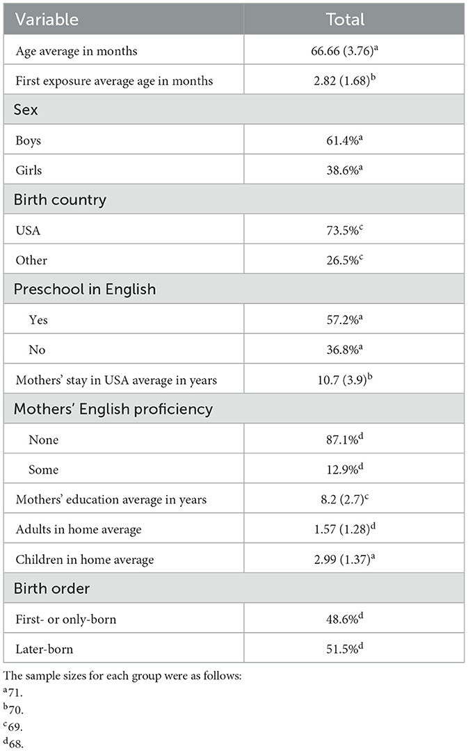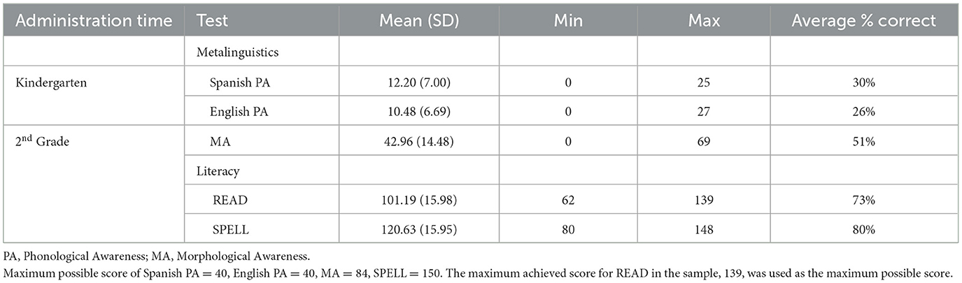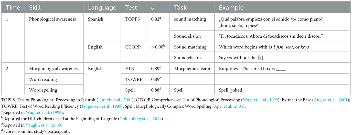 The participants consisted of 45 boys and 26 girls (n = 71) sampled from two public schools in an area with a high concentration of Spanish-speakers in Memphis, Tennessee. The present analysis draws on data from a larger longitudinal project examining language and literacy development in Spanish-speaking English-learning DLLs. While the current study focuses on cross-linguistic relationships among phonological awareness, morphological awareness, and single-word reading and writing in English, related components of the broader study are reported elsewhere (e.g., Burrows et al., 2019; Durant et al., 2024; Gibson et al., 2012; McMillen et al., 2020; Oller et al., 2007). Following IRB approval and informed consent to participate in the study collected during the child's kindergarten year, each child's caregiver completed a questionnaire that had been translated into Spanish. According to parents' reports, Spanish was the primary language in the home. Demographic information collected during kindergarten, are reported in Table 1. Testing was conducted at two points in time, first in the last 3 months of kindergarten (Mage = 5 years and 8 months), and again in the middle of 2nd grade (Mage = 7 years and 6 months). Chi-square calculations revealed that there were significantly more boys than girls in the study, χ2 (1, N = 71) = 5.09, p = 0.02, and more children in the sample had siblings than did not have siblings, χ2 (1, N = 71) = 36.63, p < 0.001.