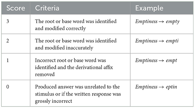 MA skill was measured by the Extract the Base Test (ETB; August et al., 2001). For this task, students were presented a derived word both orally and in writing, such as emptiness, and then were asked to write a word in the blank to finish a sentence, such as “The cereal box is ______.” To correctly answer this question, the student must analyze the stimulus to identify the component derivational morphemes, separate them, identify the root morpheme, and make a surface form that finishes the sentence. A 4-point raw score scale, informed by Carlo et al. (2004), was developed to score the morphological analysis accuracy of ETB responses, presented in Table 3 (see Durant et al., 2024 for more details). The ETB is not standardized. Scores were calculated as a simple sum.