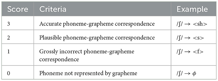 Spelling skill (SPELL) was measured with a non-standardized spelling test, developed by Apel et al. (2004). This consisted of a list of 50 words that tested English morphographemic spelling convention knowledge, such as < c> for /k/ and /s/, as in cute and center. Each word was dictated aloud, put into a sentence, and then spoken in isolation again. The SPELL score reported is the Element Score, calculated in accordance with the criteria in the Computerized Spelling Sensitivity System (CSSS) manual (Masterson and Apel, 2010). The element score reflects the accuracy of the orthographic representation of each phonological element, or sound unit, in the word as demonstrated in Table 4. See Masterson and Apel (2010) for more details. The measure reported is a sum of the phonological element score across items.