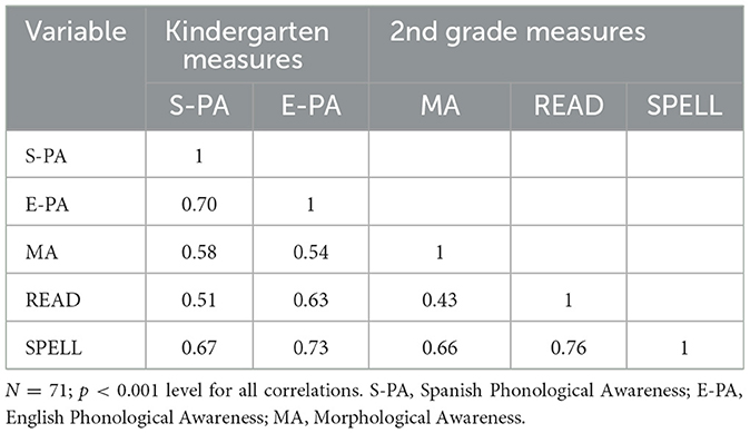 Pearson correlation coefficients are presented in Table 6. Spanish-English DLLs cross-linguistic PA skills in kindergarten were significantly and positively related to word-level MA, reading, and spelling in 2nd grade.