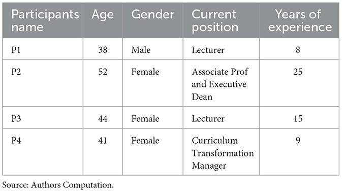 Table 1 presents biographical information about the participants, who range in age from 38 to 52 years. There are three female participants and one male participant. Their professional experience spans from eight to twenty-five years, and their current positions include two lecturers, a curriculum transformation manager, and an executive dean of the faculty. P1, P2, P3 and P4 indicate participant 1 to participant 4.