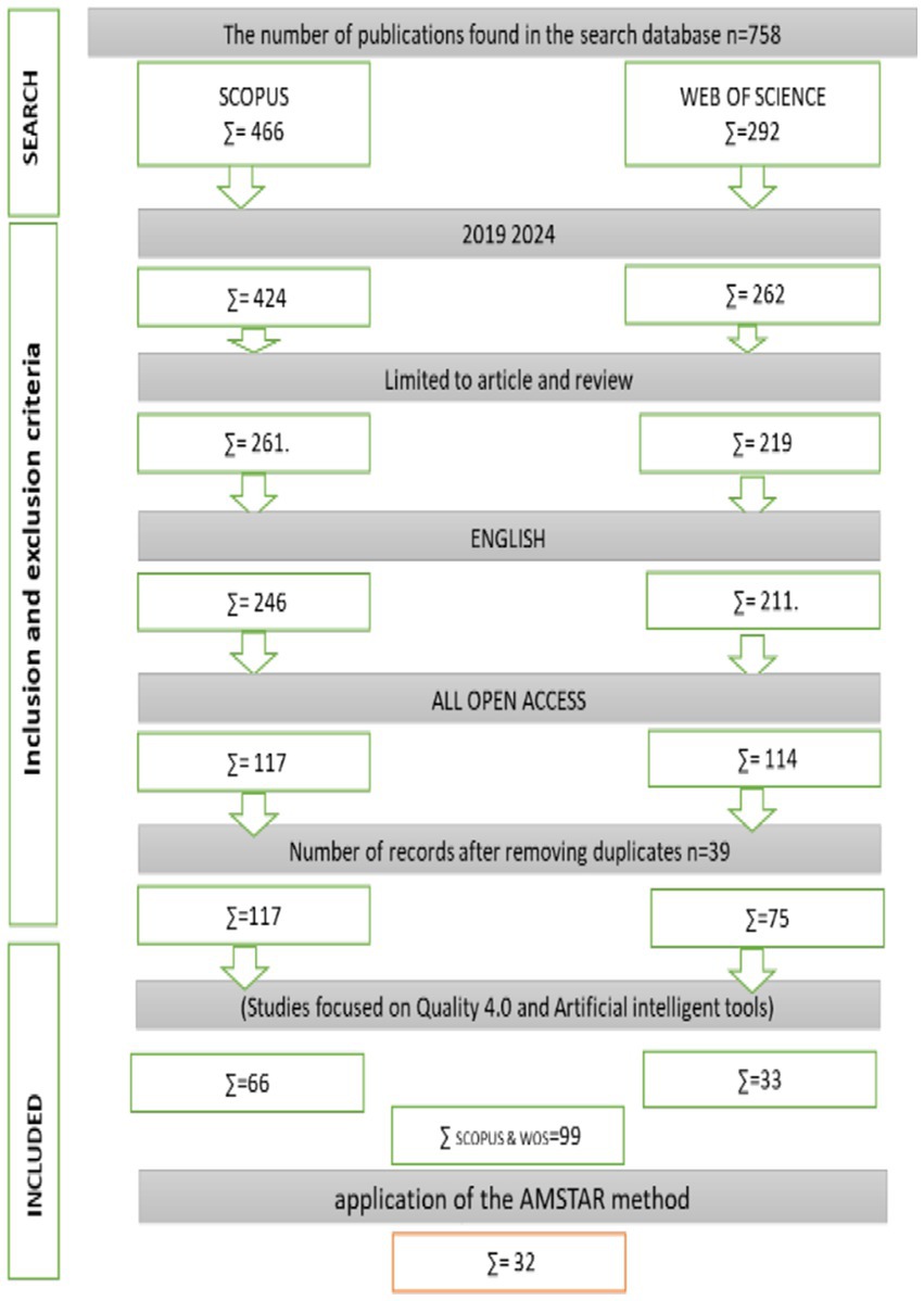 After an initial search in the Scopus and Web of Science databases, 466 and 292 articles were identified, respectively. Following a filtering process based on the publication period (2019–2024), document type (articles and reviews), language (English), and open access availability, 117 records from Scopus and 114 from WoS were retained. After removing 39 duplicates, 117 articles from Scopus and 75 from WoS remained. Titles and abstracts were then screened to ensure alignment with the research objective, specifically studies focused on Quality 4.0 and artificial intelligence tools. This led to the selection of 99 articles. Subsequently, the methodological quality of these studies was assessed using the AMSTAR checklist. Based on this evaluation, 32 articles were finally included in the review, as illustrated in Figure 1. The entire selection process was conducted by the first author of this study.