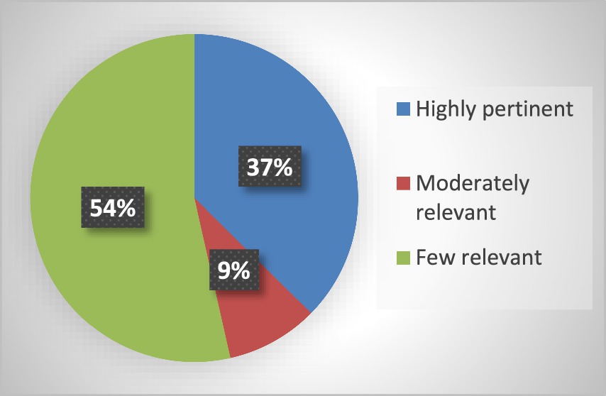 Following this assessment, Figure 2 shows that 32 articles were considered highly relevant (37%), 14 were considered moderately relevant (9%), and 53 were considered low relevant (54%).