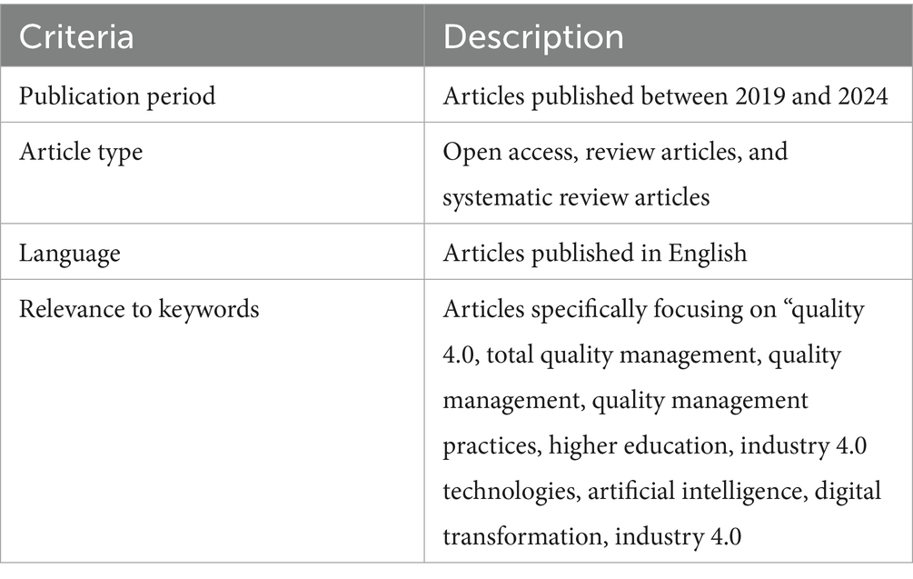 In order to answer these questions, a literature review was undertaken by consulting two renowned academic databases, Scopus and Web of Science. These databases were selected due to their comprehensiveness and multidisciplinary coverage, thus providing access to high-quality articles in the fields of quality management, education, and emerging technologies. A further exploration of the ERIC and IEEE Xplore databases is planned for future work to expand the educational and technological scope of the review. The objective of this article is to conduct a comprehensive study based on recent article published in the last 6 years (2019–2024).