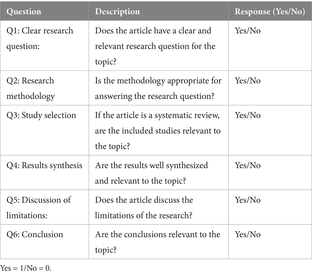 To verify the quality of the articles included in this study, we selected certain items from the AMSTAR Method (Shea et al., 2007), which typically includes 11 questions designed to assess the quality of health studies as part of a self-assessment. In our case, only six items adapted to the field of education were retained and applied to the 99 articles meeting the inclusion and exclusion criteria. These six items are presented in Table 3. Each article was assessed according to these criteria, with two possible answers for each item: “yes” (value 1) or “no” (value 0).