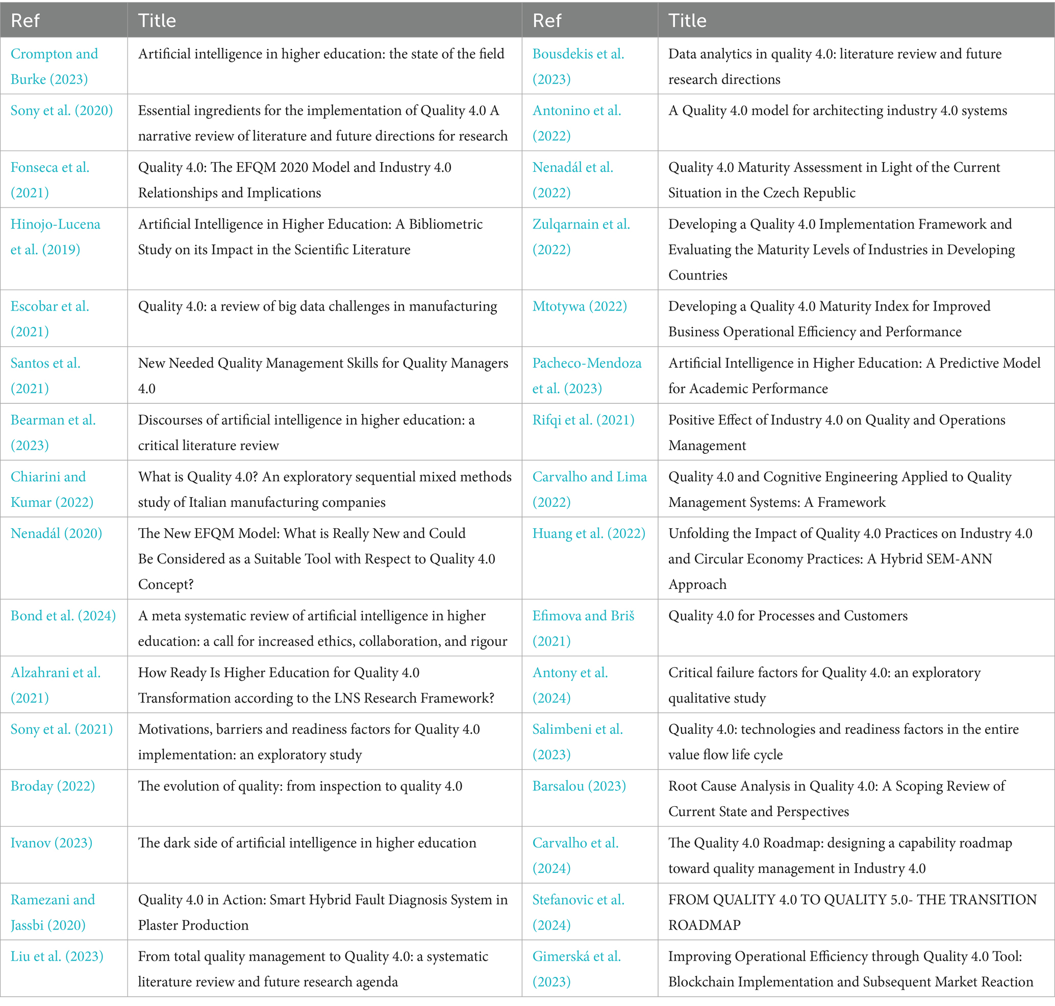 In order to answer the research questions, another excel database was created for the 32 articles, containing general information such as the title of the study, authors, year of publication and place of publication, it also contains specific information that directly addresses the research questions, such as the area of interest, the main objectives of the study, the identified I.D 4.0 technologies or AI tools used, the results obtained and its relationship with quality 4.0 and education, the limitations of the research and the citation. The 32 selected articles are presented in Table 4.