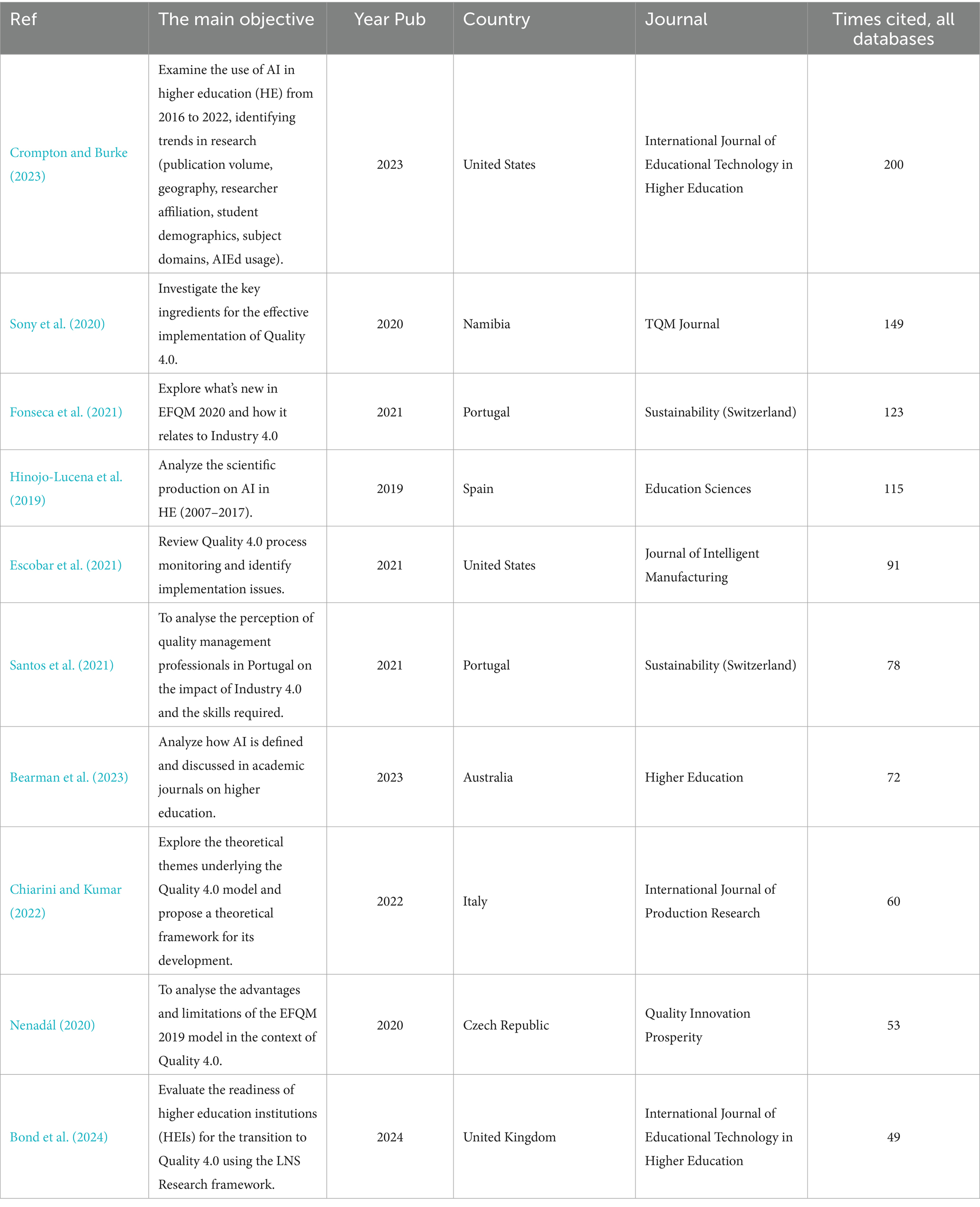 Figure 3 illustrates the number of data summaries published per year. A gradual increase in the number of publications over time is noted, with a peak in 2023. This growth reflects the sustained interest in quality management 4.0 in HE and AI. Table 5 highlights the 10 most cited studies, with notable contributions from researchers from various countries such as the United States, Portugal, and Australia. The topics covered are diverse, ranging from the use of AI in higher education to the analysis of theoretical frameworks of quality 40.