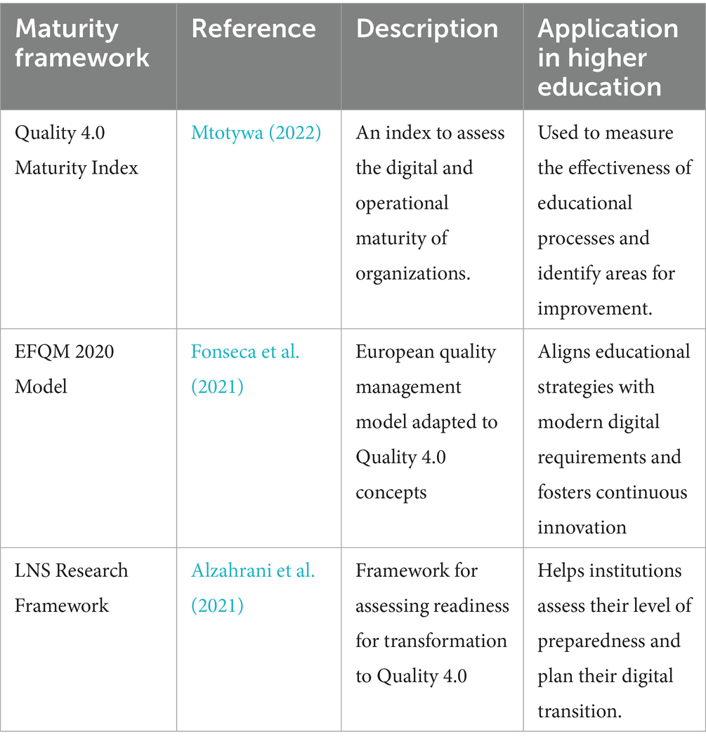 As part of the transition to Quality 4.0 in HE, the adoption of maturity frameworks is an essential strategic lever for assessing the level of development of institutions and guiding their improvement efforts. These frameworks not only provide a structured diagnosis, but also enable digital transformation to be managed with a holistic approach to quality.