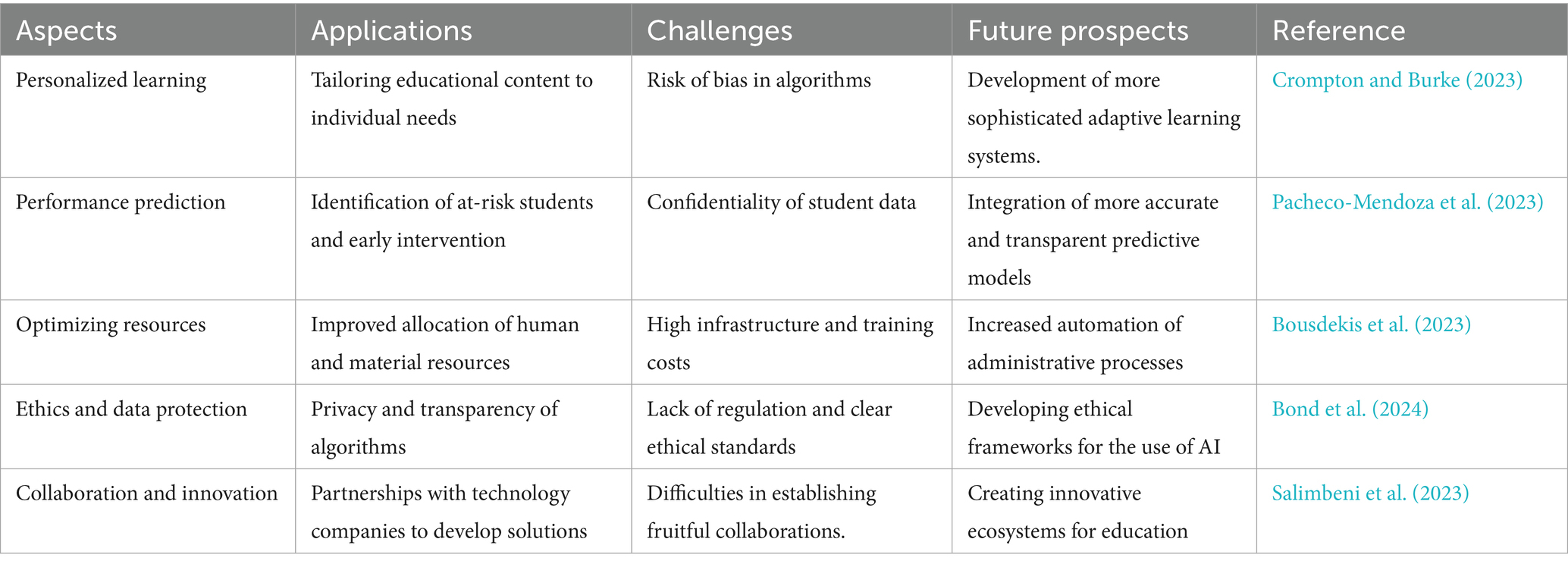 Personalized learning: Crompton and Burke (2023) highlights the importance of AI in creating personalized learning experiences. AI makes it possible to tailor educational content to students’ specific needs by analyzing their preferences, strengths and weaknesses. AI-based course recommendation systems, for example, direct learners to educational resources suited to their level and interests.