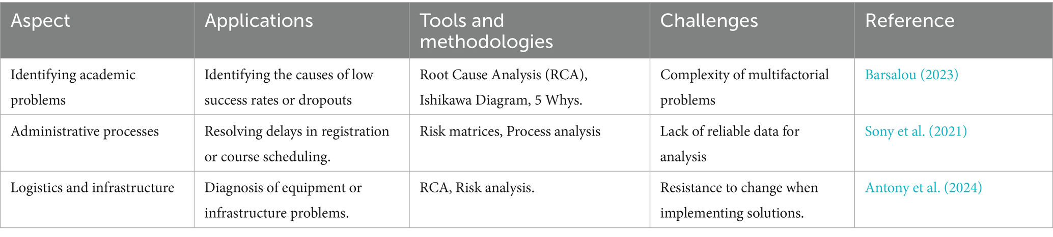RCA is also essential for improving infrastructure and logistics management. It helps identify the causes of frequent malfunctions in laboratories, libraries or transport, such as lack of maintenance or inappropriate use of equipment (Antony et al., 2024). By combining these approaches, higher education institutions can enhance operational efficiency and provide an optimized learning environment, as illustrated in Table 8, which presents some aspects of risk management and root cause analysis.