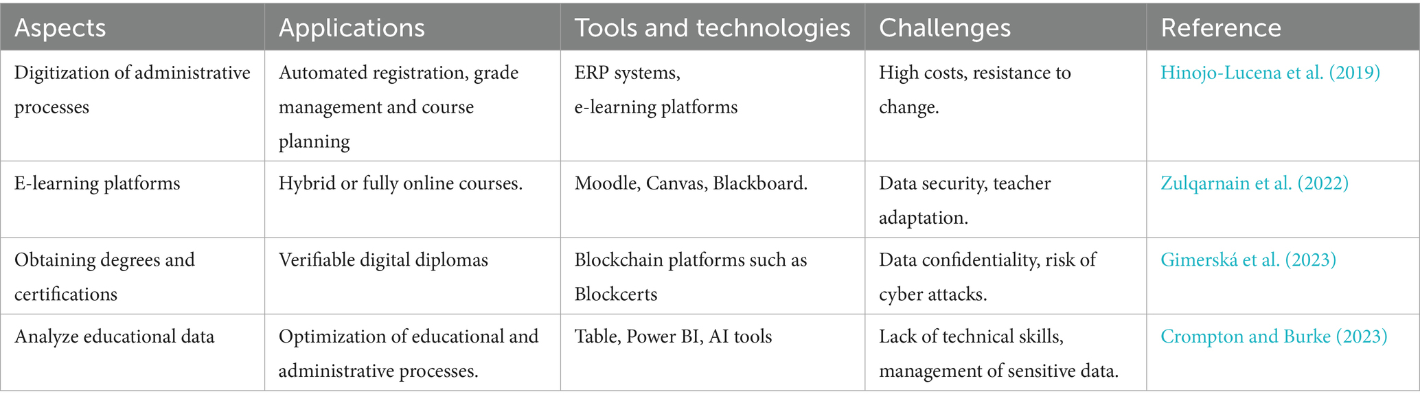 Digital transformation is a central pillar of Quality 4.0 in higher education, encompassing the digitalization of administrative and pedagogical processes, the integration of innovative technologies and the development of more flexible and accessible learning environments. The automation of administrative tasks, such as student registration, grade management and course planning, helps reduce errors and optimize resource allocation, particularly through Enterprise Resource Planning (ERP) systems, which improve the experience of students and administrative staff (Hinojo-Lucena et al., 2019). At the same time, the adoption of online learning platforms (LMS) and collaborative tools, such as Moodle, Canvas, Microsoft Teams or Google Classroom, is transforming higher education by making educational content more accessible and promoting interactive and adaptive learning (Zulqarnain et al., 2022). In addition, blockchain plays a key role in securing diplomas and certifications, ensuring their authenticity and reducing the risk of fraud through the issuance of tamper-proof digital diplomas, already adopted by several institutions (Gimerská et al., 2023). These tools and technologies are grouped in Table 9 with their challenges at that time within higher education institutions. Artificial intelligence (AI) also contributes to improving educational processes by analyzing learning data to identify trends, personalize educational paths and adapt teaching methods to students’ needs. By exploiting data from learning platforms, AI makes it possible to optimize teaching approaches and strengthen academic success (Crompton and Burke, 2023). Thus, digital transformation in higher education is establishing itself as an essential lever for improving the efficiency, transparency and quality of educational services while responding to changing institutional and student needs.