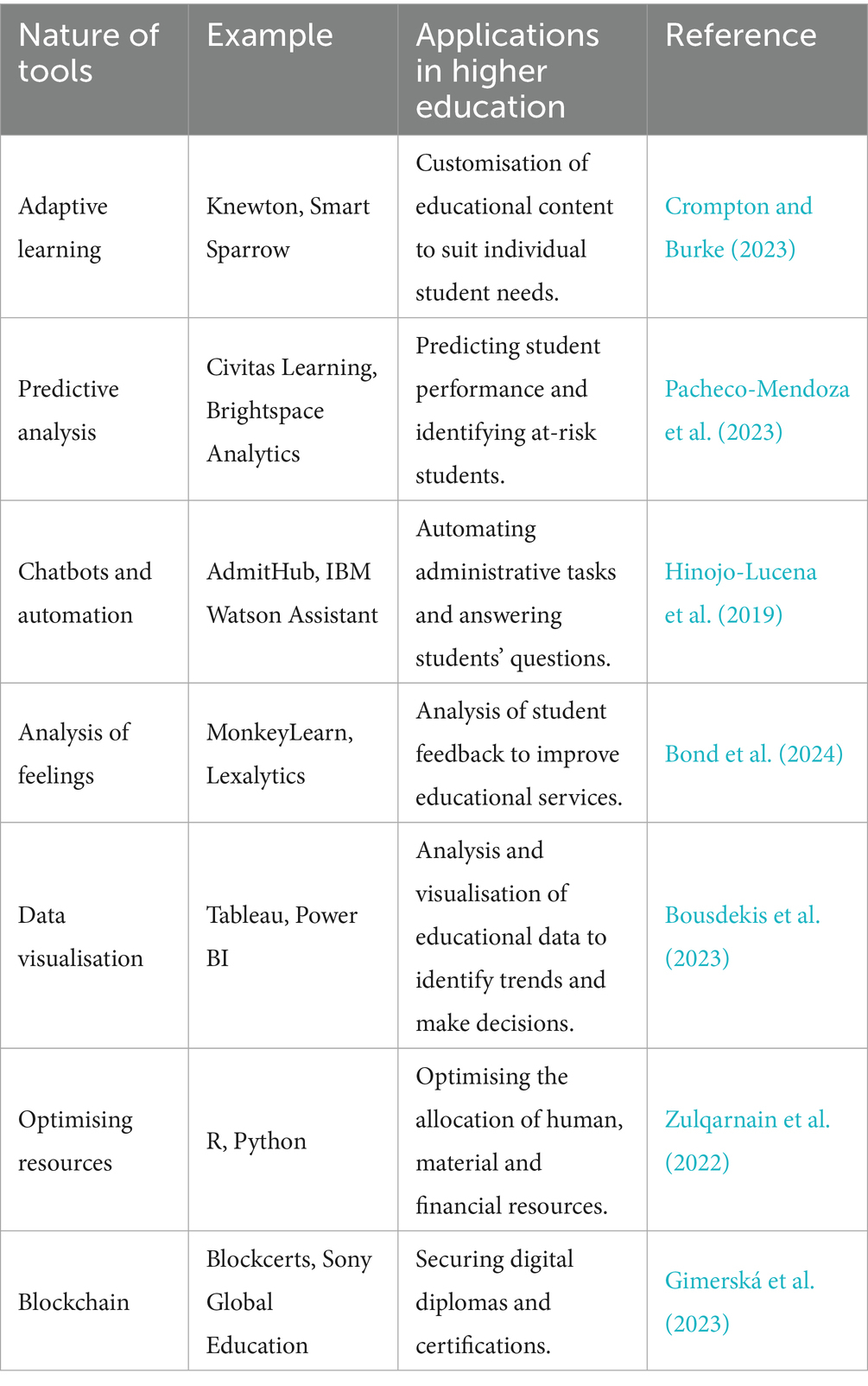 Table 10 shows the different AI technologies and tools applied to higher education, as well as their specific uses for learning improvement, administrative management and resource optimization.