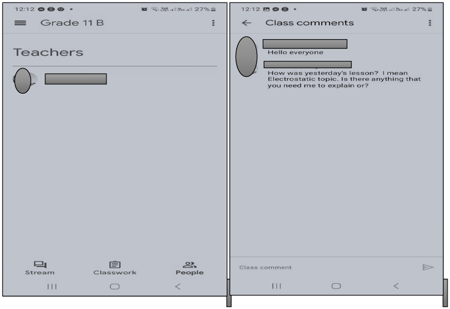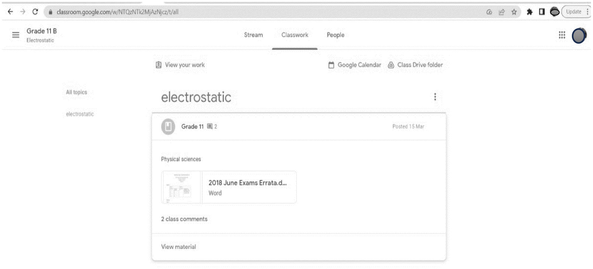 Similarly, the PST attempted to use the GC platform to communicate with his PSLs, as presented in Figure 10. That was positive since engaging PSLs through the GC platform increases their motivation, as it would have provided a room for more advanced engagements (Kola, 2017; Li et al., 2020). Moreover, it would have allowed learners to get clarity on the content they could not understand during the face-to-face class, or him adding more information that he could not during the face-to-face classroom, consequently flipping the classroom. However, his attempt to use the GC platform did not bear any fruit as no PSL was added. The PST proceeded by uploading a task to the platform, as presented in Figure 11. Nonetheless, no PSL was there to do and submit the task, as PST indicated that he did not have a laptop to manage his smooth usage of the GC platform.