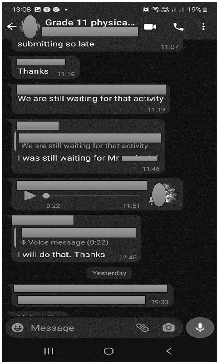 That in itself had an effect on his self-directedness as he could take the initiative on his own even after the intervention. However, he seemed to be more comfortable using the WhatsApp application, as can be seen in Figures 12, 13. Nevertheless, during the intervention, he was taken through on how to use the SM platform to teach Physical Science. In addition to that, he could not use it effectively, so learners had to remind him to send them an activity (see Figure 12). That, on its own, could have also demotivated learners from learning Physical Sciences through the SM platform.