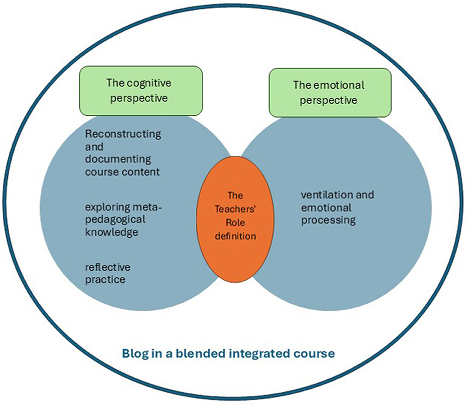 Figure 1 depicts these findings, emphasizing the blog's central roles: three with a cognitive dimension (Themes 1–3), one with an emotional dimension (Theme 4), and one that bridges the two (Theme 5). The blog serves as a powerful tool for retaining, reviewing, and documenting lesson content, with pre-service teachers leveraging it, to theoretically and interpretively articulate their accounts and reflections of the lesson. This finding aligns with reports from educational literature that has identified personal blogs as a tool for reinforcing memory, through review of the content and engagement with it (Biberman-Shalev, 2018). As documenting and writing effectively facilitate content retention and implementation, this positions the blog as a key instructional tool. Moreover, the blog provided a foundation for writing insights, formulating hypotheses, and generating further questions related to the course material. In this manner, it plays a pivotal role in processing course content.