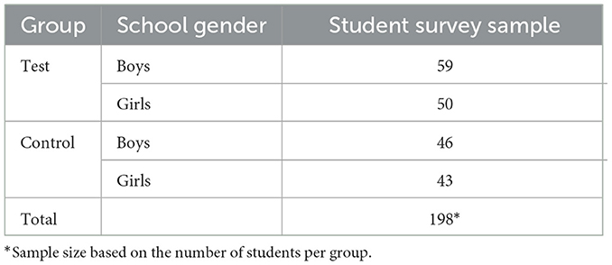 A two-stage sampling procedure was employed. First, four public middle schools in Abu Dhabi with similar characteristics—such as size, location, and student capacity—were selected to enhance comparability (Creswell and Clark, 2017). Second, one male and one female school were randomly assigned to the treatment group (receiving laptops), while the remaining two were assigned to the control group. Within each school, two 8th-grade classes were chosen, capturing a broad range of academic performance levels to ensure adequate representation and variability within the sample. This sampling approach ensured that each group contained enough students (at least 30) to allow for reliable statistical analysis (Babbie, 2020) (see Table 1).