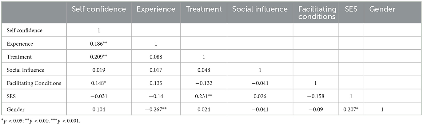 The correlation analysis (Tables 2, 3) reveals several significant relationships between the dependent variables (self-confidence and self-efficacy) and the independent variables, including experience, treatment, social influence, facilitating conditions, socioeconomic status (SES), and gender.