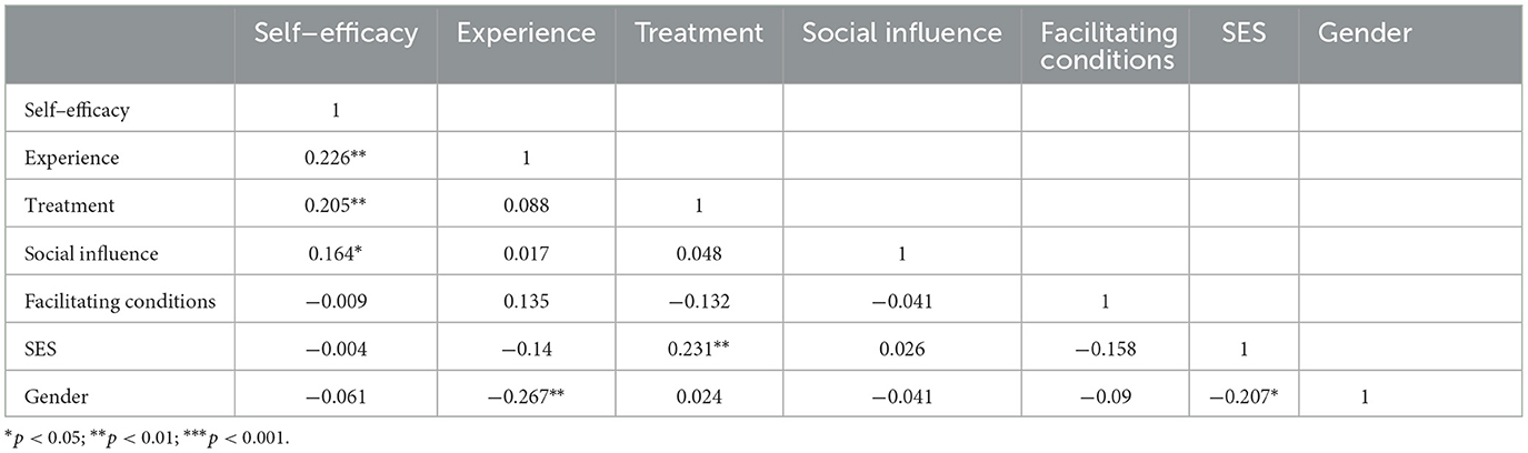 For self-efficacy (Table 3), the results indicated a positive correlation with experience (r = 0.226, p<0.01), showing that frequent ICT use outside of school was linked to greater self-efficacy in using digital devices. Treatment was also positively correlated with self-efficacy (r = 0.205, p<0.01), suggesting that students in the treatment group had higher self-efficacy than those in the control group. Additionally, social influence was positively correlated with self-efficacy (r = 0.164, p<0.05), indicating that positive perceptions of social support for technology use were associated with greater self-efficacy. Gender had a weak negative correlation with self-efficacy (r = −0.061), though it was not statistically significant, indicating no strong gender differences in self-efficacy. Facilitating conditions and SES were not significantly correlated with self-efficacy.