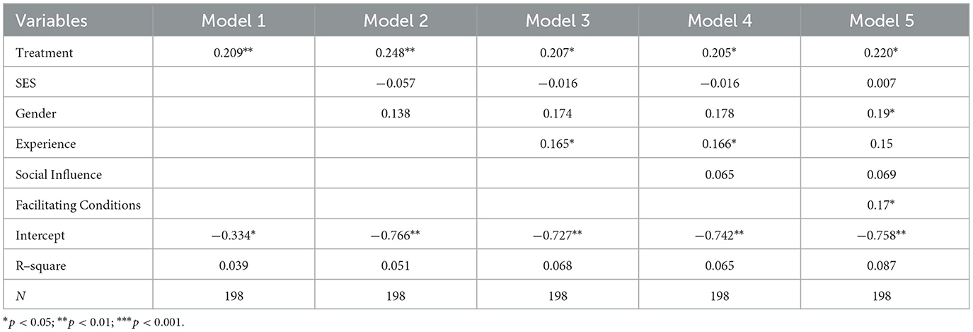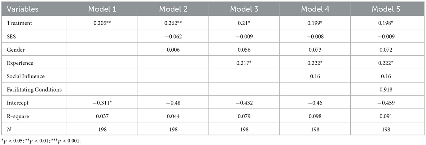 Other variables, including SES, gender, social influence, and facilitating conditions, were not statistically significant in Model 5. Although social influence had some effect in earlier models, its impact was not robust when all factors were included, suggesting that experience and treatment are more consistent predictors of self-efficacy. Overall, the results highlight that both the laptop intervention (treatment) and experience with technology are key factors in enhancing students' self-efficacy, underscoring the importance of providing direct access to technology in the classroom and fostering prior ICT experience.