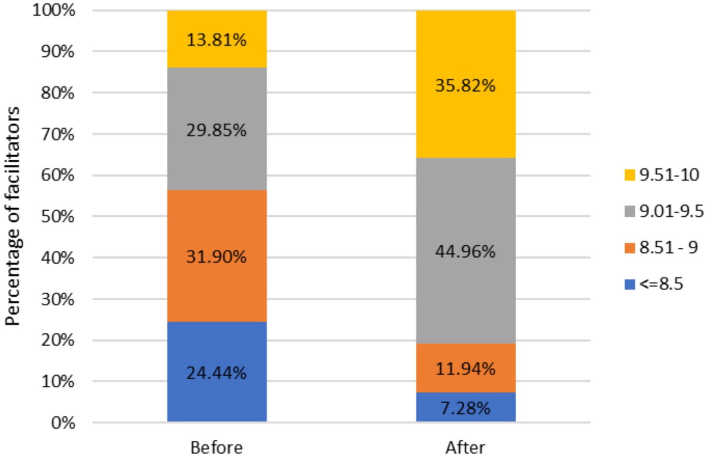 Evaluation data from CE learners demonstrated a notable improvement in facilitators’ performance following attendance at the INSPIRA workshop. As shown in Table 3 and Figure 2, only 43.66% of facilitators received evaluations above nine before INSPIRA, but this number nearly doubled to 80.78% after the workshop.