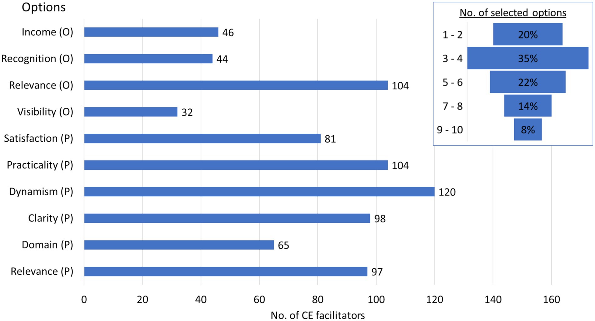 Figure 4. Number of facilitators selecting the specified option among the ten provided in Section 3 of the survey, regarding how the INSPIRA workshop has affected their competencies (P) and sense of job satisfaction (O) (N = 158).