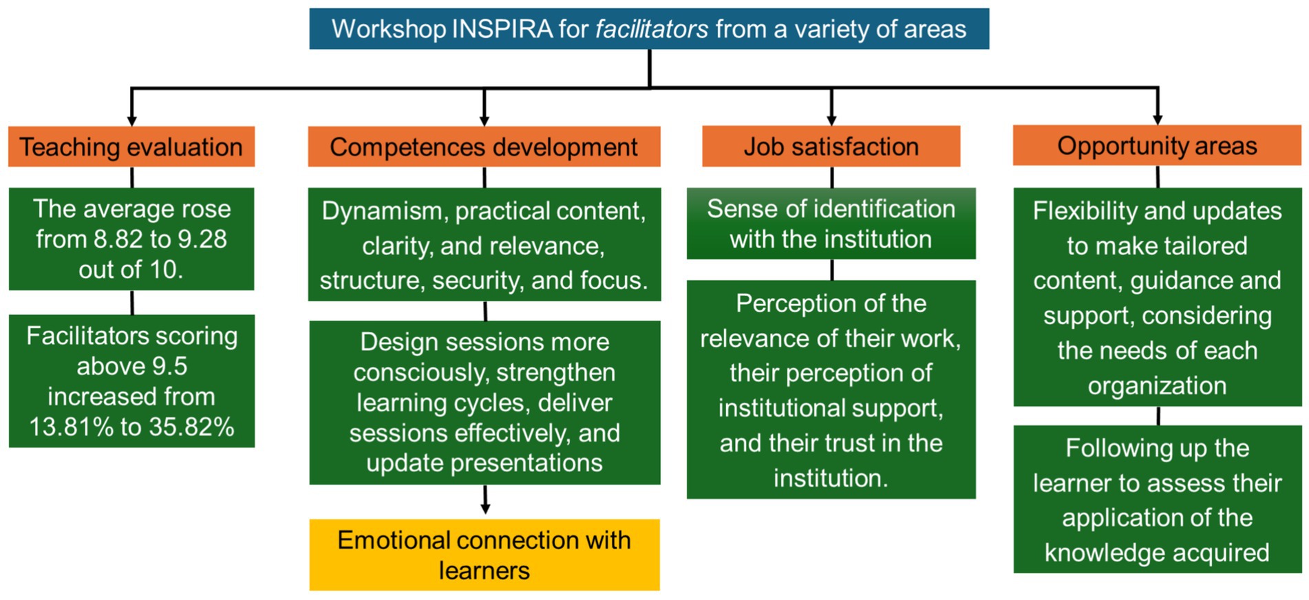 This study examined the effectiveness of the INSPIRA workshop from the perspective of CE facilitators at a private university in Mexico. Quantitative findings showed statistically significant improvements in facilitator evaluations following the workshop, particularly in the clarity, dynamism, and relevance of the content. Qualitative data reinforced these findings, suggesting enhanced instructional design, stronger emotional connections with learners, and a shift toward more structured and learner-centered teaching. However, areas such as the “Real Challenges” and “Advice” stages of the INSPIRA model require better integration.