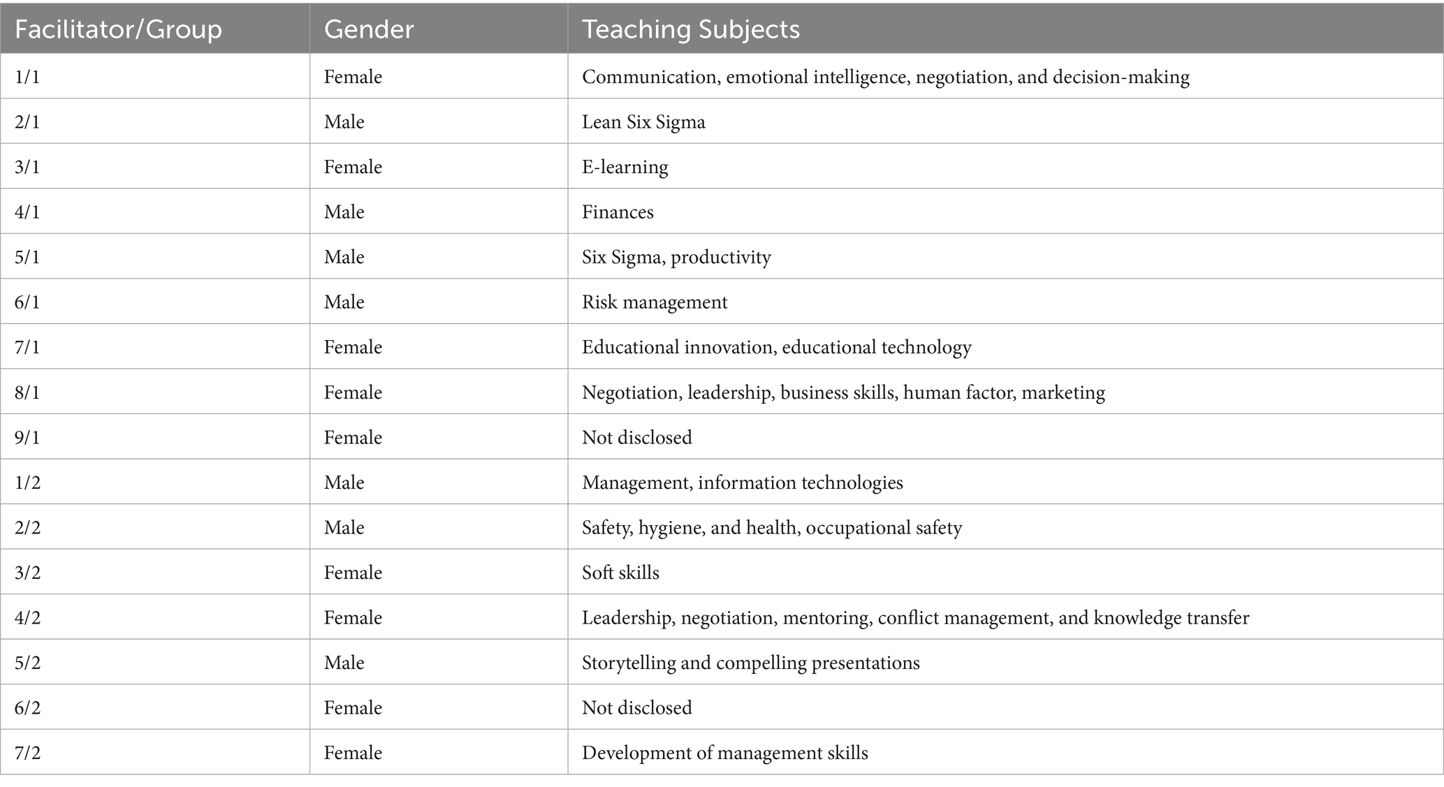 Descriptive statistics and inferential tests were conducted using Excel and Jamovi. A Shapiro–Wilk test was used to assess normality. Paired-sample t-tests were used to compare facilitators’ teaching evaluations before and after the workshop. ANOVA and Pearson correlations were used to explore the relationships between survey responses and demographic variables. Thematic analysis was applied to the open-ended survey responses and focus group transcripts, following the guidelines of Hennink et al. (2019). Manual codification involved three progressive rounds by two independent reviewers to ensure inter-coder reliability.